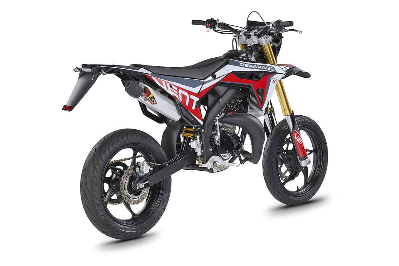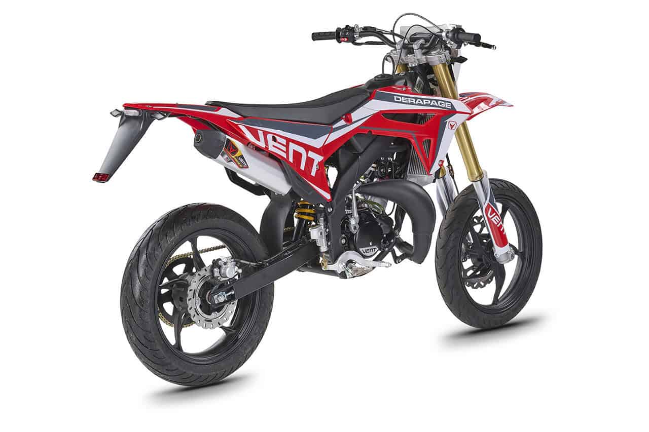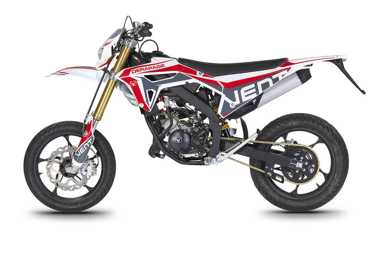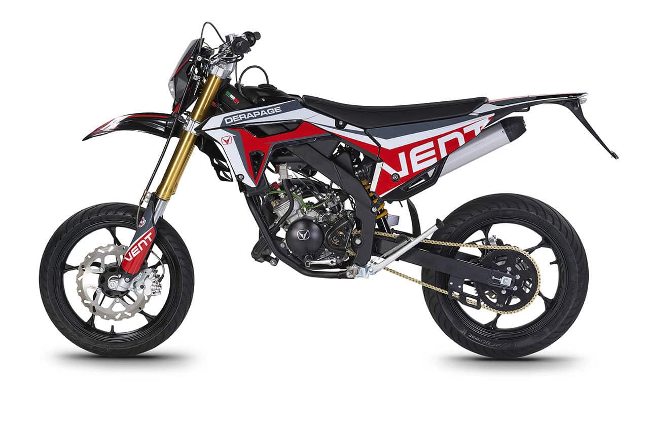 Die erste Erfahrung mit dem Motorrad wird für immer in Erinnerung bleiben! DERAPAGE 50 ist die Motard , mit der man sich dem täglichen Verkehr stellen kann, um sicher zur Schule zu fahren und mit Freunden Spaß zu haben, ohne dabei auf echten Rennstil zu verzichten, dank der Replika-Grafik des VENT-Teams , das an der nationalen Motard-Meisterschaft teilnimmt, und der fortschrittlichen technischen Ausstattung , die einem Motorrad mit größerem Hubraum würdig ist. Der spritzige Minarelli 50 ccm 2-Takt-Motor der neuesten Generation, der robuste Perimeter-Rahmen in Verbindung mit der 41 mm Upside-Down-Federung und die leistungsstarke Bremsanlage mit 290 mm Scheiben machen die DERAPAGE 50 zum Referenzmotorrad auf dem Markt in Bezug auf Leistung, Zuverlässigkeit und Sicherheit.