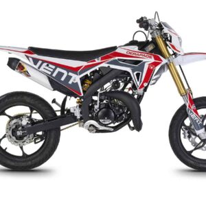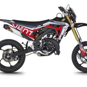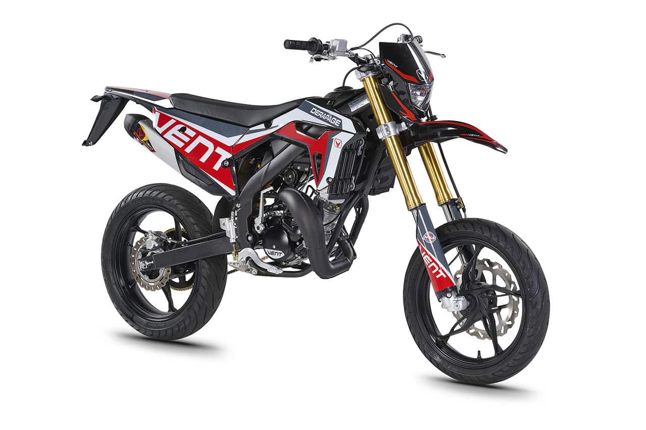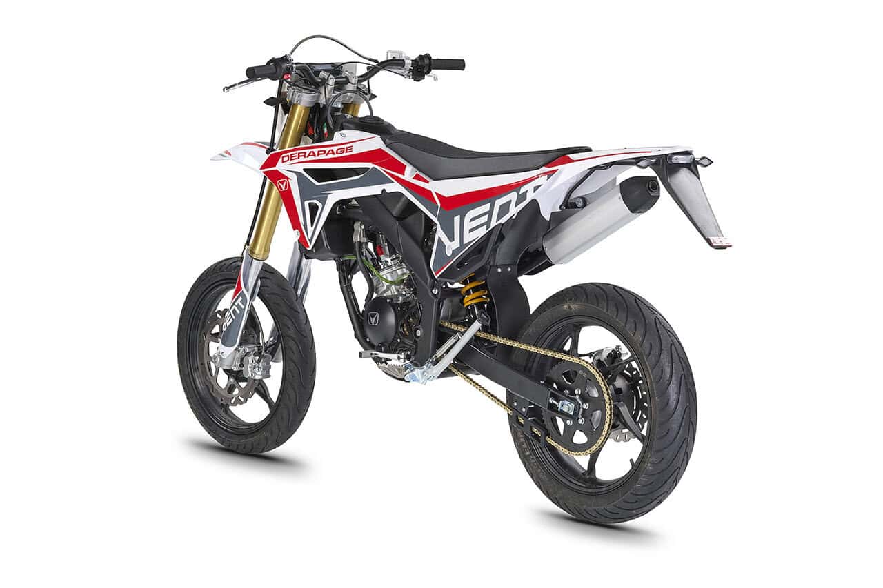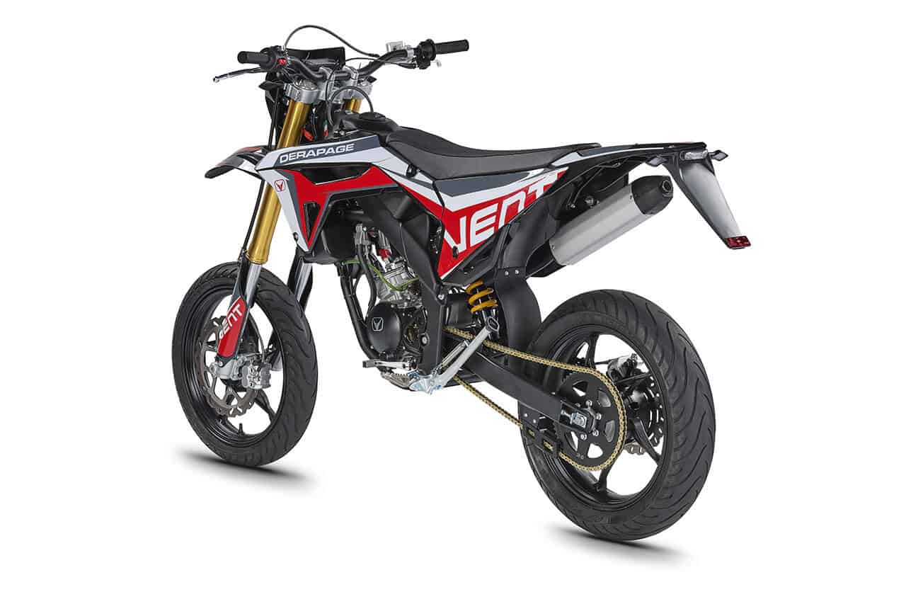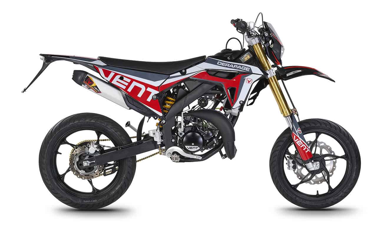 Die erste Erfahrung mit dem Motorrad wird für immer in Erinnerung bleiben! DERAPAGE 50 ist die Motard , mit der man sich dem täglichen Verkehr stellen kann, um sicher zur Schule zu fahren und mit Freunden Spaß zu haben, ohne dabei auf echten Rennstil zu verzichten, dank der Replika-Grafik des VENT-Teams , das an der nationalen Motard-Meisterschaft teilnimmt, und der fortschrittlichen technischen Ausstattung , die einem Motorrad mit größerem Hubraum würdig ist. Der spritzige Minarelli 50 ccm 2-Takt-Motor der neuesten Generation, der robuste Perimeter-Rahmen in Verbindung mit der 41 mm Upside-Down-Federung und die leistungsstarke Bremsanlage mit 290 mm Scheiben machen die DERAPAGE 50 zum Referenzmotorrad auf dem Markt in Bezug auf Leistung, Zuverlässigkeit und Sicherheit.